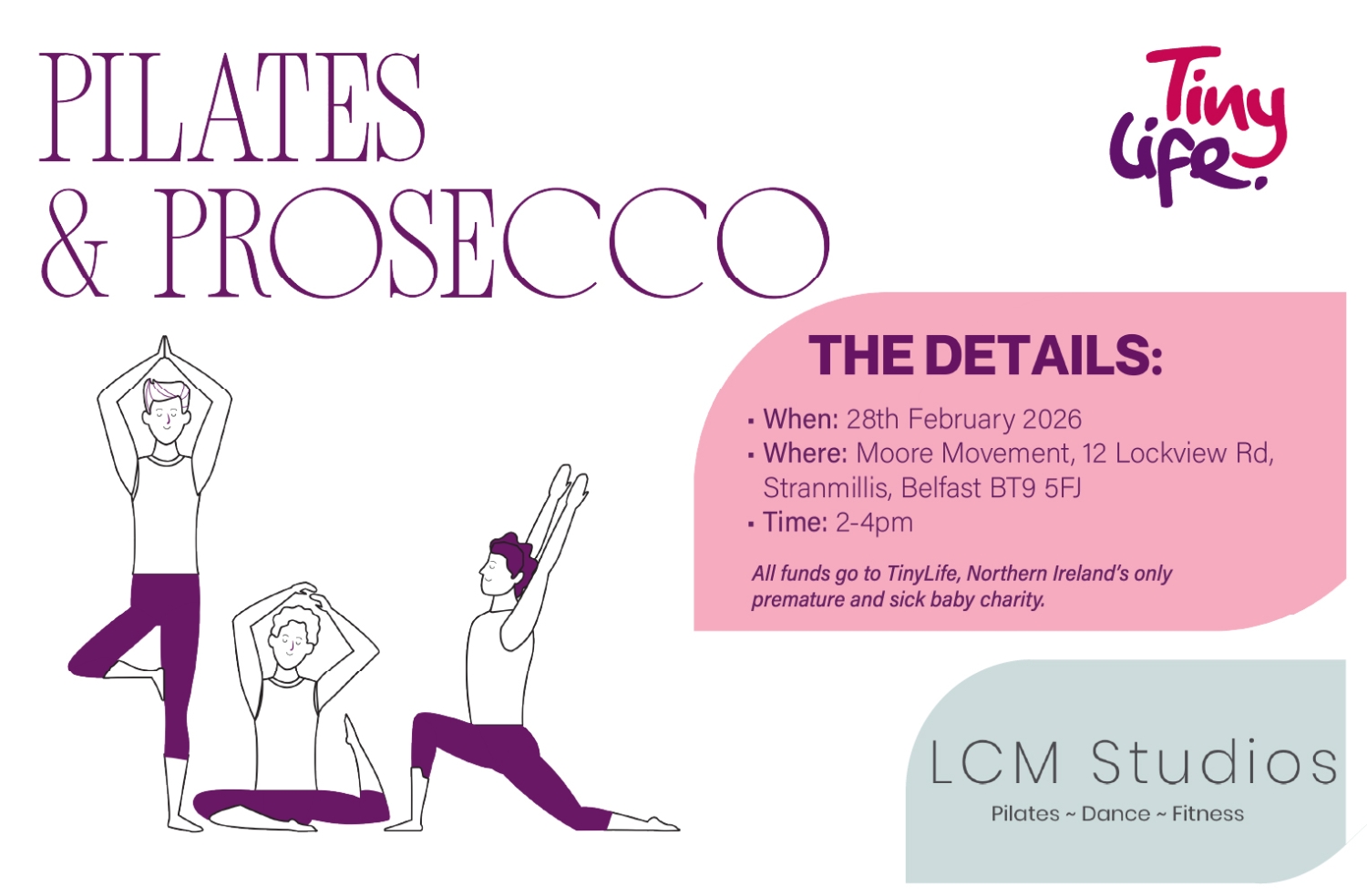 From2-4pm at Moore Movement, Stranmillis, we're teaming up with LCM Studios for an uplifting Pilates session followed by well-earned prosecco and treats, all in support of the incredible work of TinyLife!